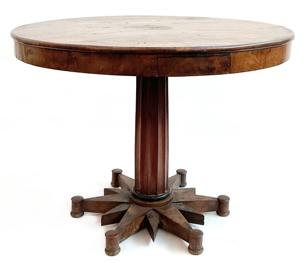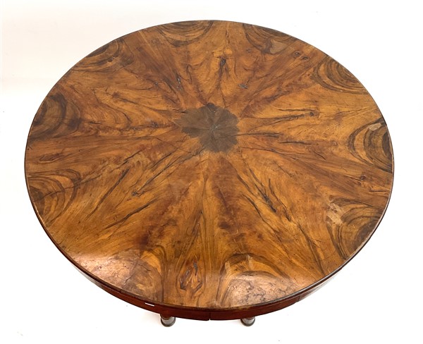 Tavolo con piano circolare lastronato in radica di noce e quattro cassetti nella fascia, sostegno a colonna scanalata su base a stella con sei piedi. Secolo XIX (d cm 105, h cm 77) (difetti)