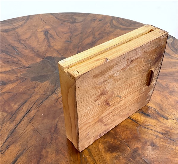 Tavolo con piano circolare lastronato in radica di noce e quattro cassetti nell