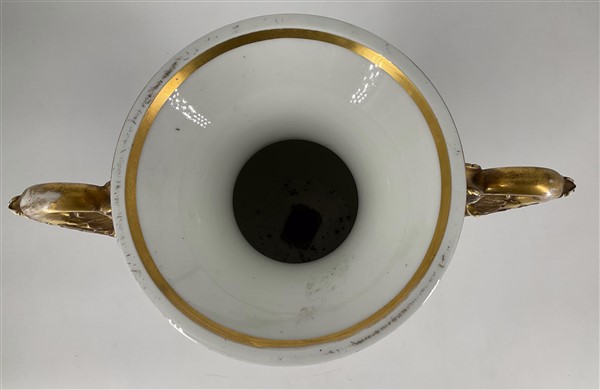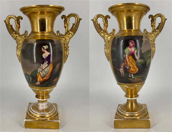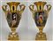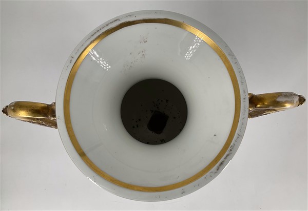 Manifattura del secolo XIX. Coppia di vasi biansati in porcellana dipinta in po
