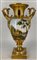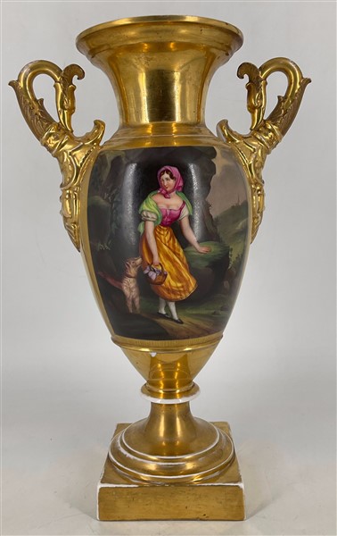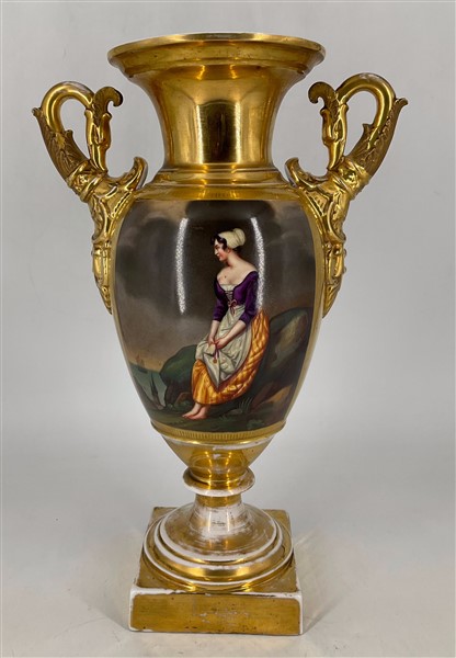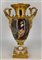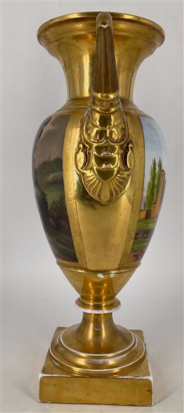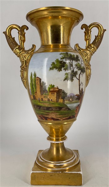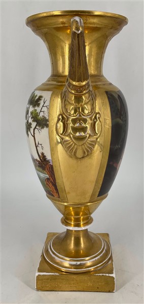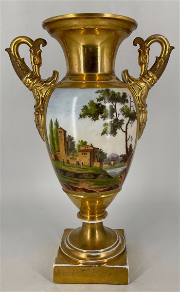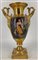 Manifattura del secolo XIX. Coppia di vasi biansati in porcellana dipinta in policromia con figure e paesaggi entro riserva su fondo dorato, anse a collo di cigno (h cm 42) (difetti)