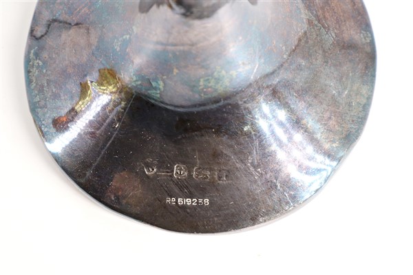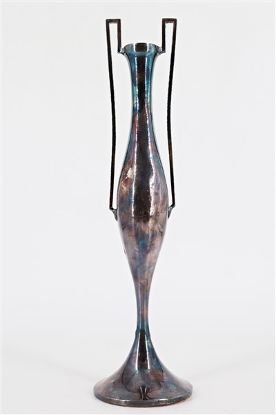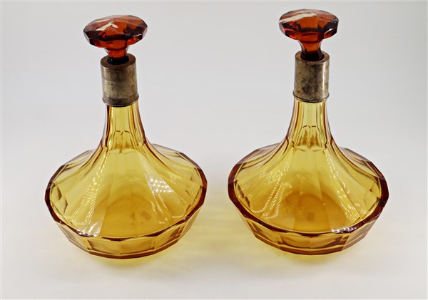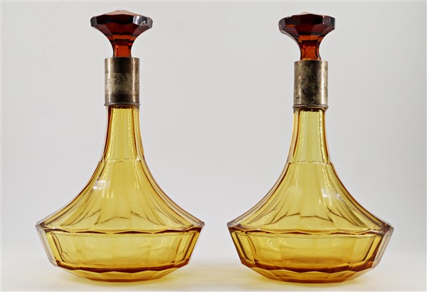 Lotto composto da coppia di bottiglie in vetro ambrato e molato con tappo e collo in argento unito a un vasetto soliflore biansato in argento inglese. Base appesantita (h max cm 26,5) (difetti)