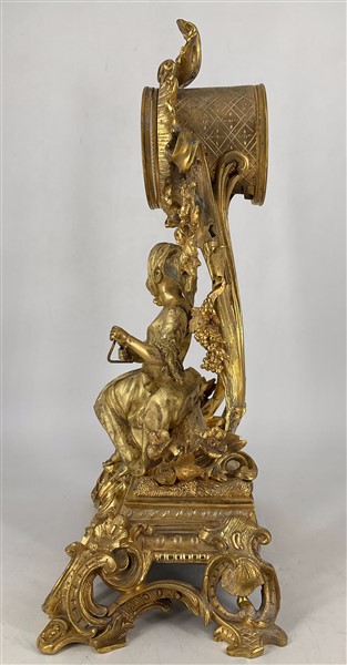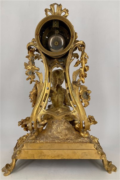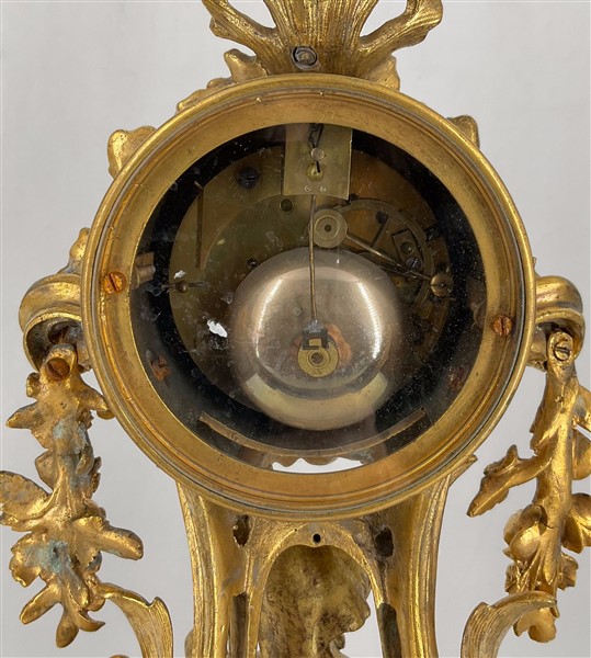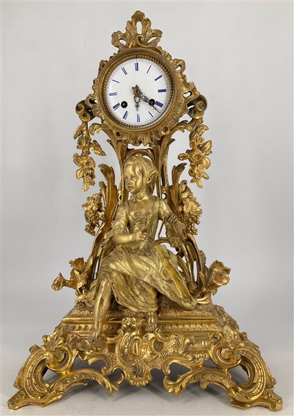 Pendola in metallo a soggetto bucolico riccamente decorata. Quadrante in smalto bianco a numeri romani. Movimento a due treni con suoneria delle ore e mezze su campanello. Fine secolo XIX (h cm 51) (difetti, mancanze e sostituzioni, è probabile che il quadrante e la macchina siano più antichi della cassa. Il pendolo non è originale)
