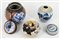 Gruppo di tre piccole giare in procellana policroma decorate con animali fantastici e motivi floreali