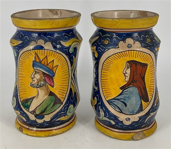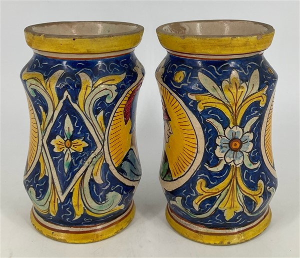 Manifattura di Caltagirone, bottega di Gesualdo di Bartolo, secolo XIX. Coppia di albarelli in maiolica decorati a motivi naturalistici stilizzati e profili maschili entro riserve su fondo giallo (h cm 28; d cm 11) (difetti)