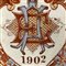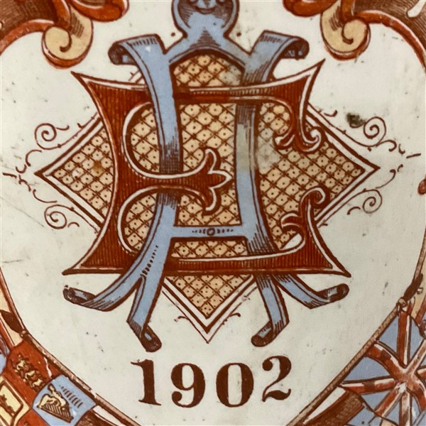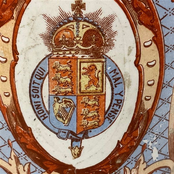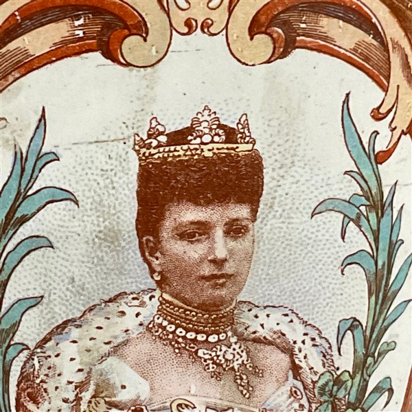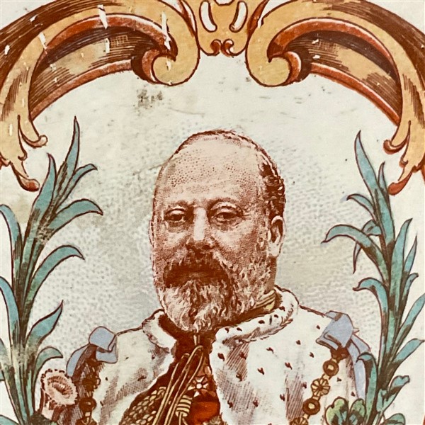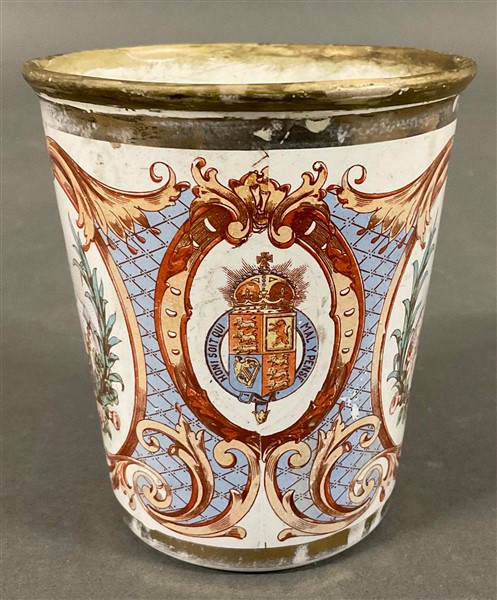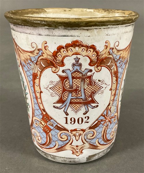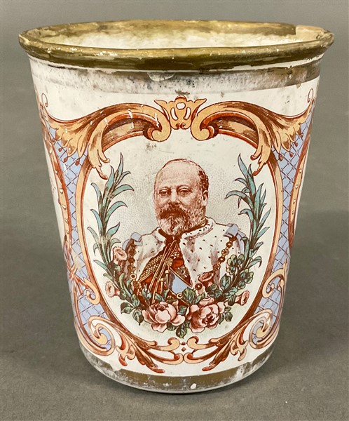 Bicchiere commemorativo in metallo smaltato decorato in policromia con i profili di Edoardo VII e Alessandra di Danimarca entro riserva a volute, stemma della Giarrettiera e monogramma datato 1902 anno dell'incoronazione del Re (h. cm 9) (difetti)