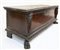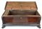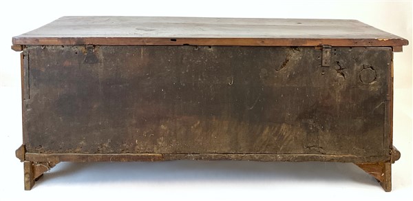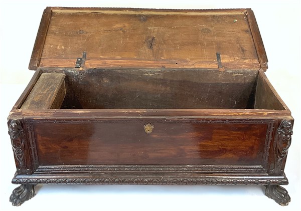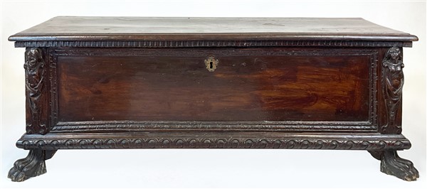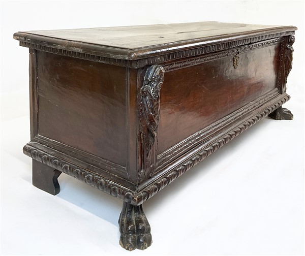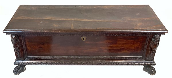 Cassapanca in noce con montanti a figure intagliate, bordure unghiate e baccellate, piedi ferini. Secolo XVIII (cm 158x58x58) (difetti e restauri)