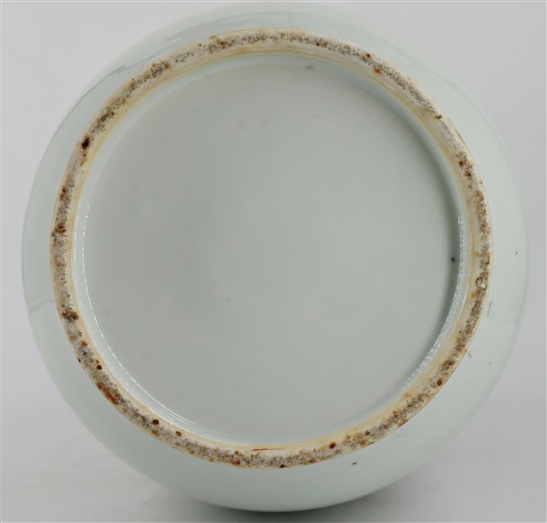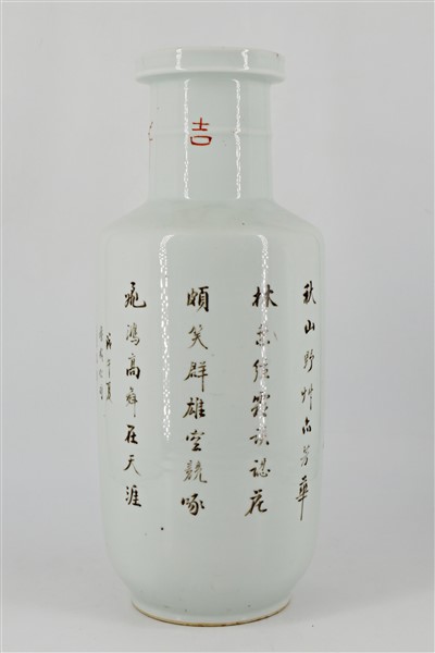 Vaso in porcellana policroma decorato con scritte e galli in un paesaggio Cina,