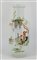 Vaso in porcellana policroma decoratoa con scritte e galli in un paesaggio