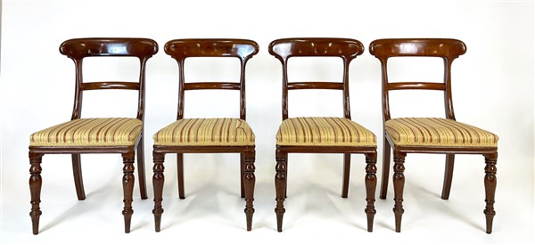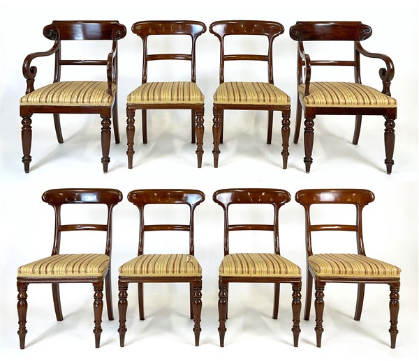 Lotto composto da sei sedie e coppia di poltrone in mogano con gambe anteriori tornite e posteriori a sciabola. Secolo XIX (lievi difetti)
