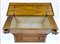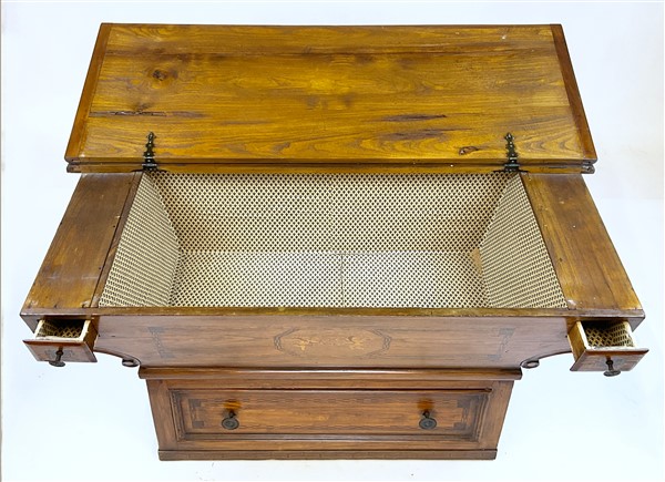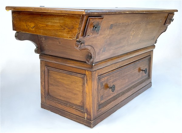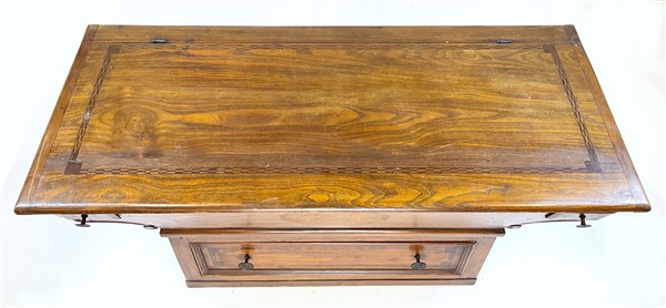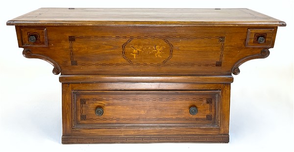 Madia in legni vari ad un cassetto e due tiretti sotto piano, fronte decorato da intarsi con amorini e cornici filettate, piano ribaltabile (cm 127x65x54) (difetti)