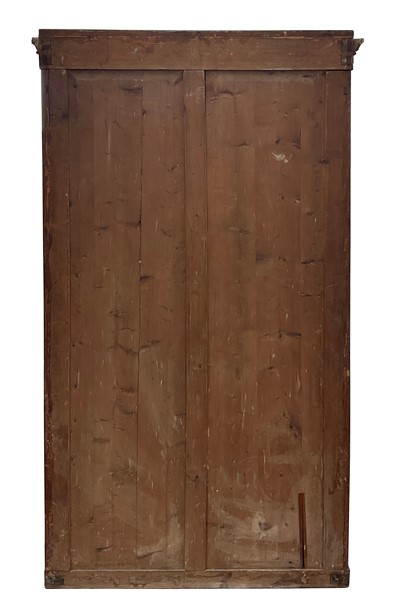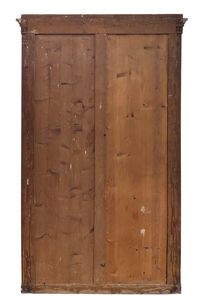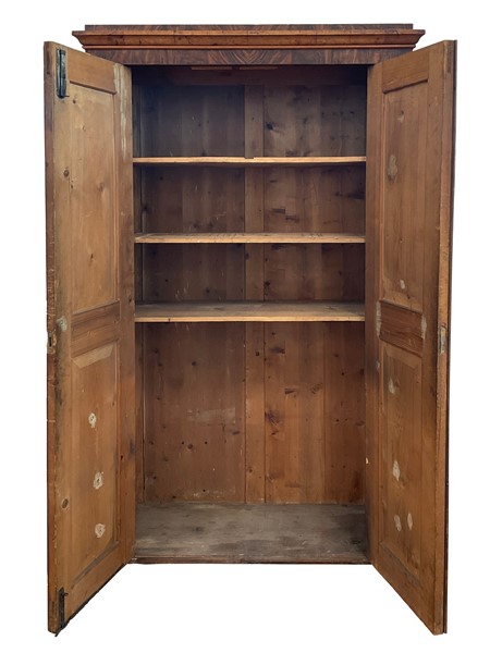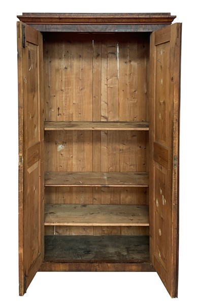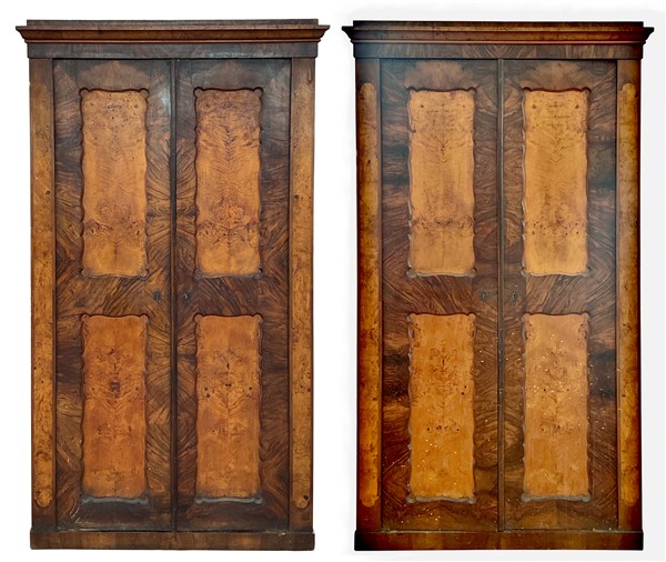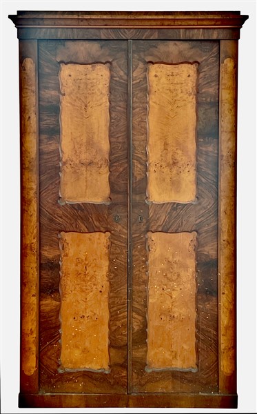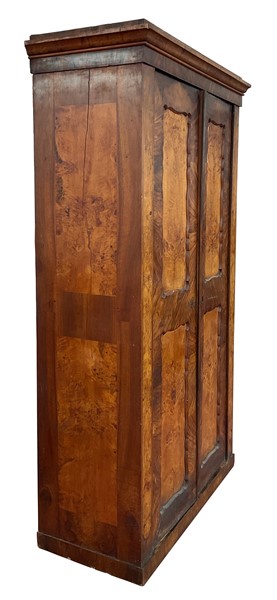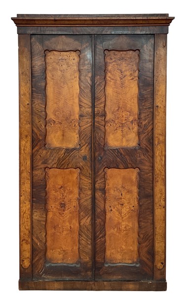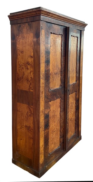 Coppia di armadi impiallacciati in radiche di legni vari a due ante con pannellature sagomate. Secolo XIX (cm 122x213x54) (difetti)