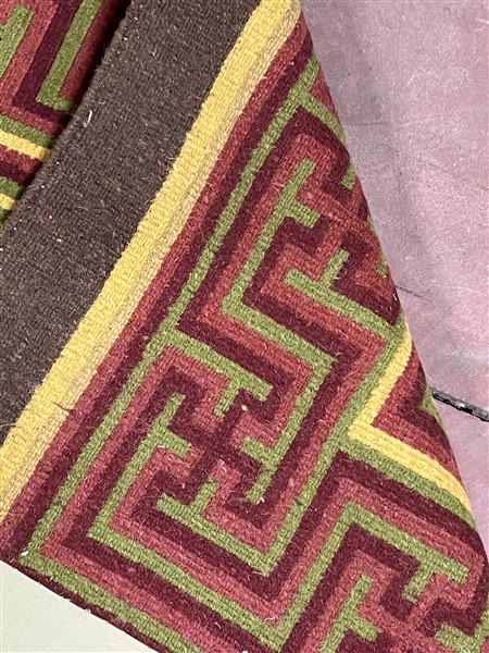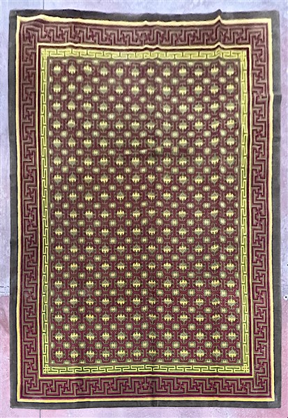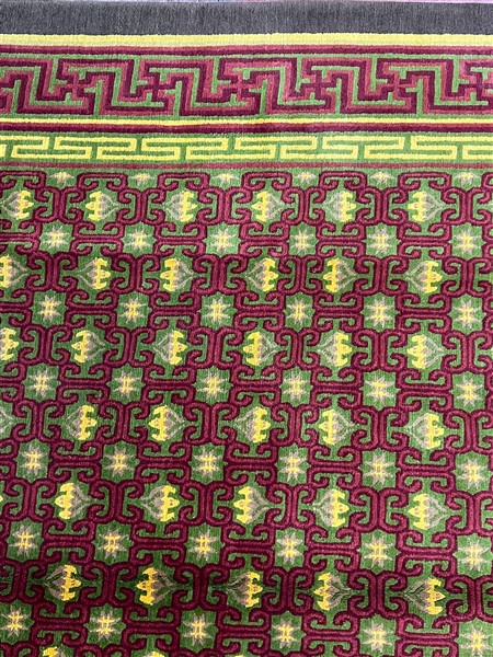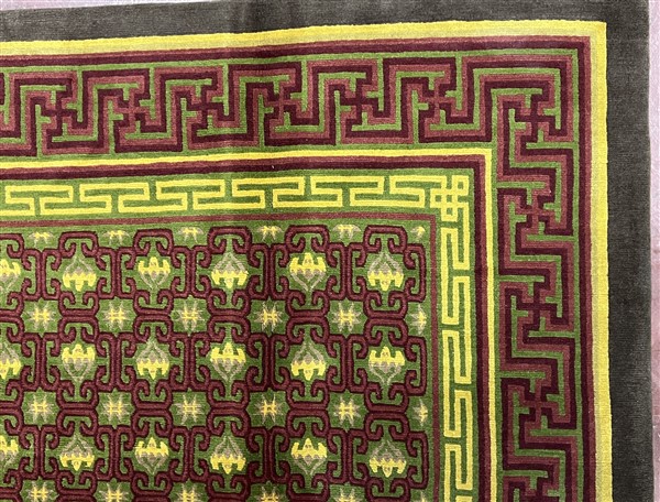 Tappeto Nepal, manifattura recente. Decoro all over con griglia Bordeaux blu su fondo verde (cm 322x220) (difetti)