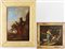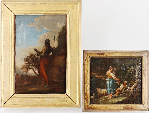 Due antichi dipinti ad olio su tela (di cui uno applicato su tavola) raffiguranti "Soldato in un paesaggio" e "Pastori in un paesaggio"