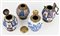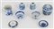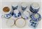Lotto composto da quattro piccole giare, una serie di piccoli contenitori, e una tazzina in porcellana bianca e blu