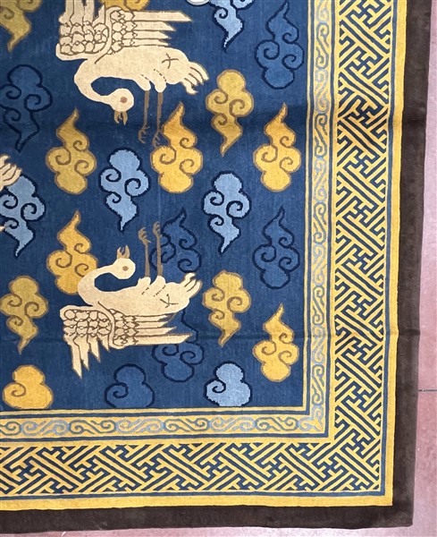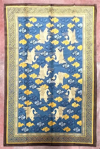 Tappeto Nepal, recente manifattura. Decoro con volatili e nuvole su campo azzur