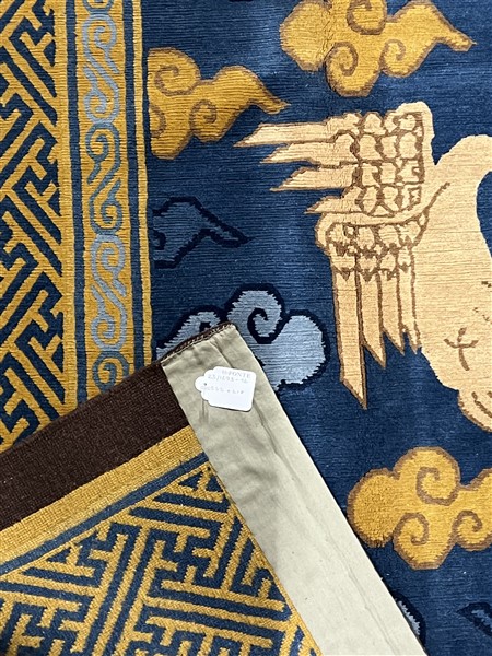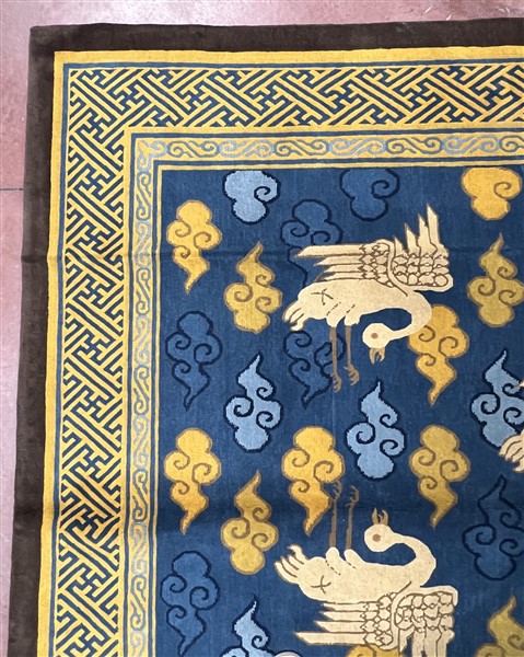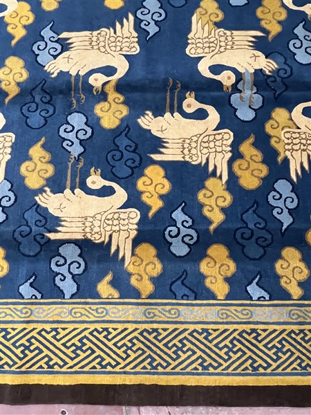 Tappeto Nepal, recente manifattura. Decoro con volatili e nuvole su campo azzurro (cm 332x218) (difetti)