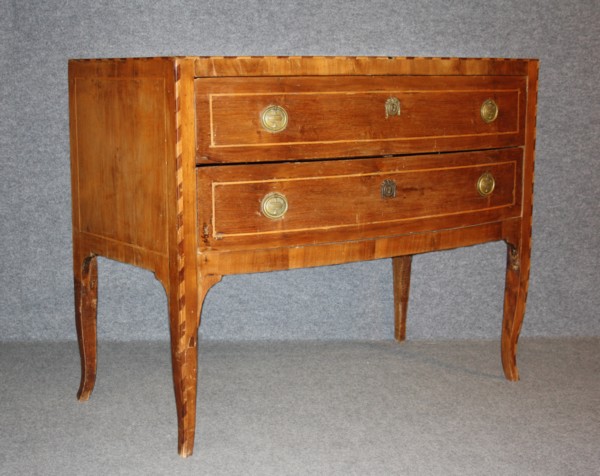 Comò due cassetti in legno di noce filettato in legni vari, fronte curvo. Veneto. XVIII secolo. Mis. Lung. cm. 113 Alt. cm. 90 Prof. cm. 58,5 ca.