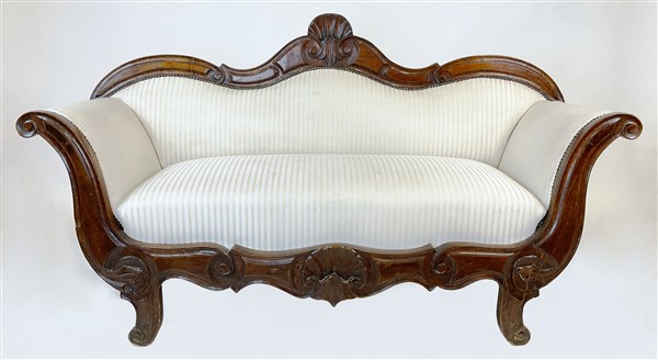 Divano a barca in noce intagliato con fronte e cimasa decorati a valva di conchiglia. Secolo XIX (l cm 172) (difetti)