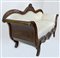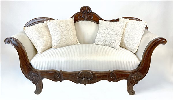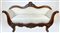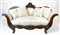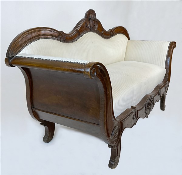 Divano a barca in noce intagliato con fronte e cimasa decorati a valva di conch