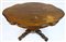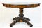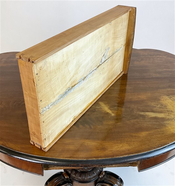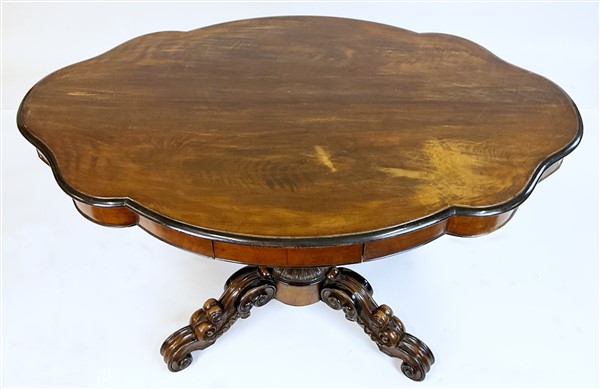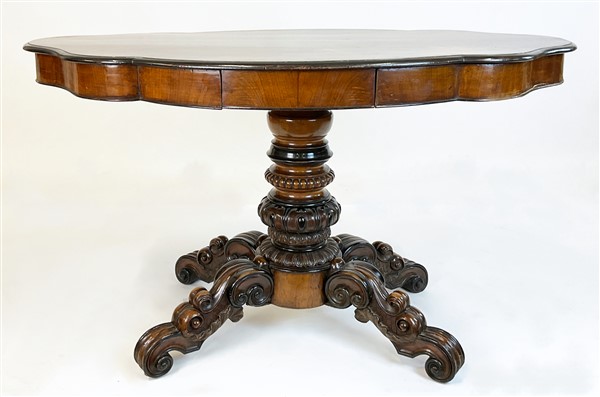 Tavolo a biscotto lastronato in piuma di mogano e profilato in legno ebanizzato. Piano sagomato, un cassetto nella fascia, sostegno tornito e baccellato, gambe terminanti a ricciolo. Secolo XIX (cm 133x76x86) (difetti)