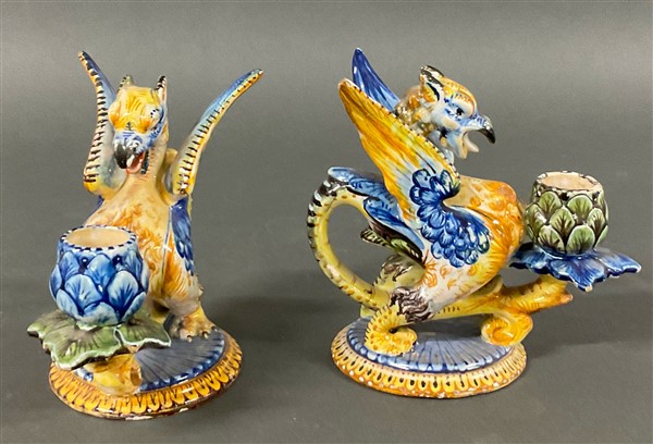 Manifattura Cantagalli, coppia di candelieri in maiolica dipinta in policromia a forma di grifoni (cm 15x18) (difetti)