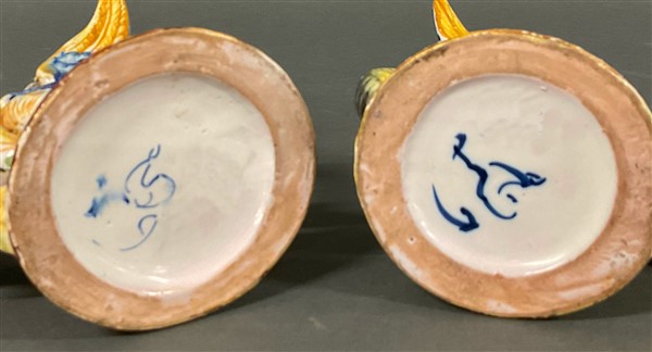 Manifattura Cantagalli, coppia di candelieri in maiolica dipinta in policromia