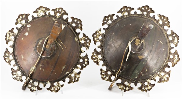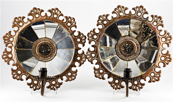 Lot 1292 | Coppia di appliques ad una luce in rame traforato e specchi a settori (h cm 33)