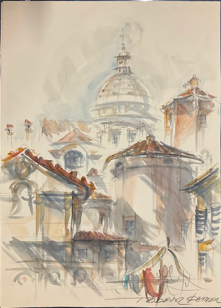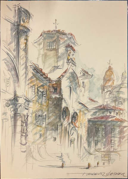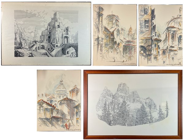 Lotto composto da un disegno a matita raffigurante paesaggio montano e firmato Alvaro e datato '93 (cm 65x95), una china su carta raffigurante paesaggio di autore indecifrato (cm 70x99) e tre acquerelli raffiguranti scorci cittadini (cm 70x50) firmati Katner. Due opere in cornice
