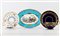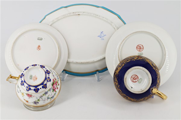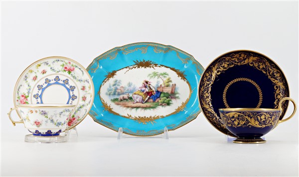 Manifattura di Sèvres, secolo XIX. Lotto composto da una ciotola ovale dipinta a scena galante in policromia entro riserva su fondo azzurro, una tazza con piatto decorata a girali in oro su fondo blu e una tazza con piatto decorata a fiori, profili in oro (cm max 22,5x16,5) (lievi difetti)