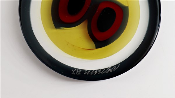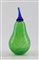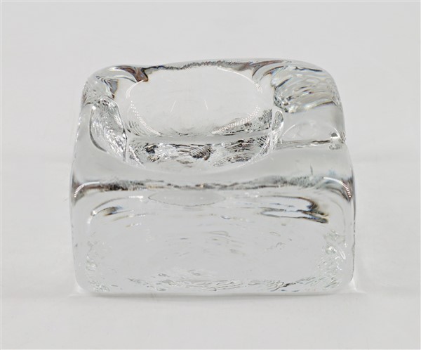 Lotto composto da un portacandela in vetro soffiato trasparente incolore con orlo azzurro di manifattura muranese, una pera in vetro della manifattura Kosta Boda, un posacenere in vetro trasparente incolore e un tondo a murrine in vetro firmato a punta "Venini 87". Seconda metà secolo XX. (h max cm 20) (lievi difetti)