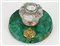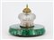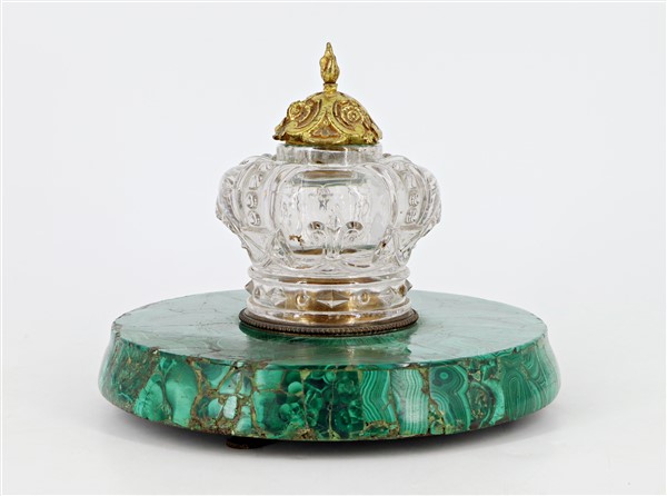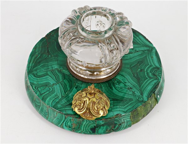 Calamaio in vetro a forma di corona con coperchio in bronzo, base rivestita in malachite (d cm 18,5, h cm 13) (difetti e mancanze)