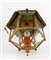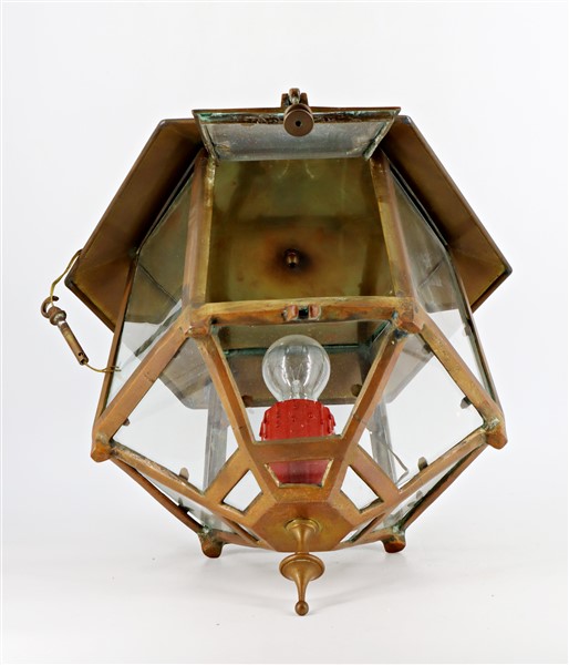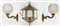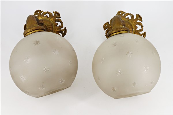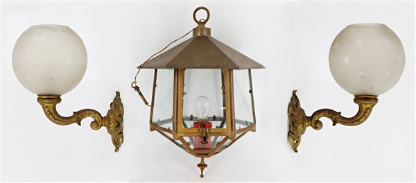 Lotto composto da una coppia di applique con bracci in metallo dorato e diffusori globulari in vetro satinato decorati da stelle molate (l cm 28), ed una lanterna da parete a sezione esagonale in rame e vetro (h cm 50) (difetti)