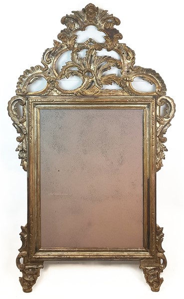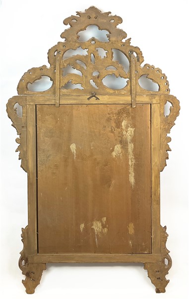 Specchiera in legno intagliato e dorato a mecca, di forma rettangolare con cimasa e fregi traforati a volute rocaille (cm 160x95) (difetti)