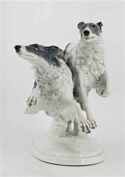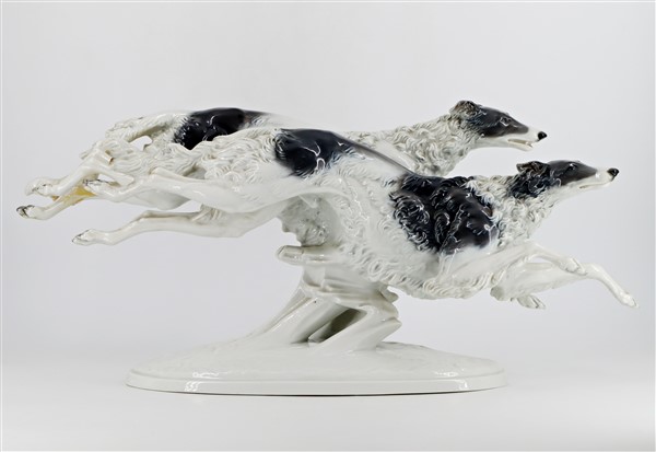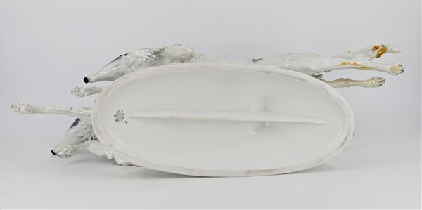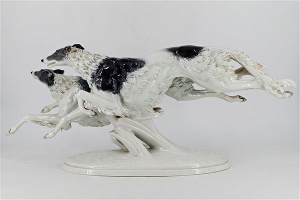 Manifattura di Rosenthal, scultura in porcellana dipinta raffigurante un coppia di levrieri in corsa, marcata sotto la base. Secolo XX (l cm 66, h cm 26) (lievi difetti)