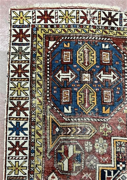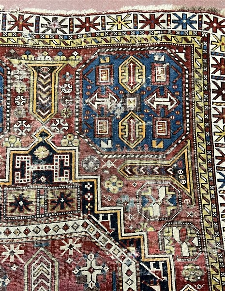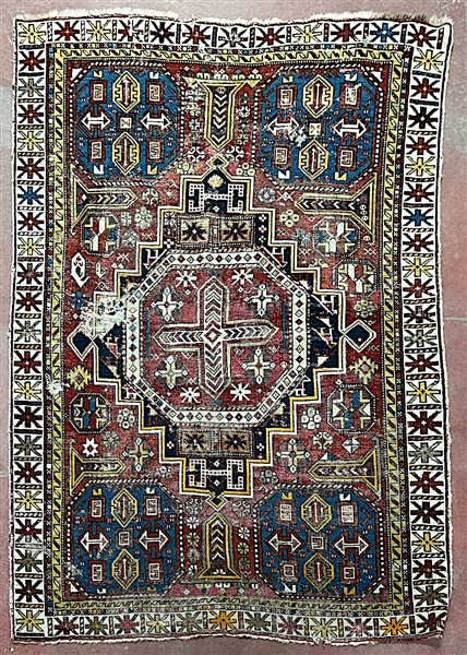 Tappeto Shirwan, Caucaso, inizio secolo XX. Decoro con grande medaglione rosso e blu su campo rosso, quattro Gül angolari a fondo azzurro (cm 161x115) (difetti e rapature)