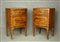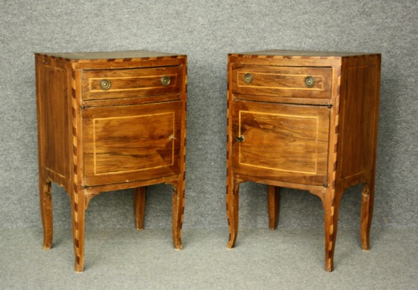 Coppia di comodini in legno di noce filettati in legni vari, fronte curvo. Veneto. XVIII secolo. Mis. Lung. cm. 42 Alt. cm. 71 Prof. cm. 34 ca.
