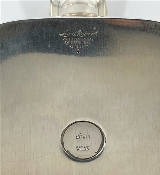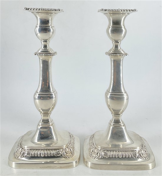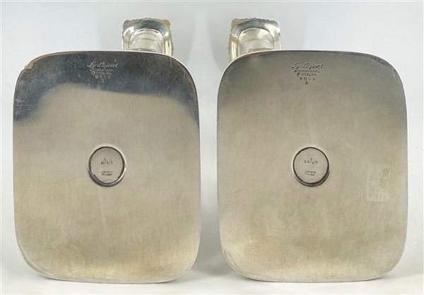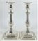 Coppia di candelieri in argento sterling a sezione rettangolare con fasce decorate a motivi fogliacei. Marcati sotto la base Lord Robert (g 2000 lordi, basi appesantite) (h cm 28) (lievi difetti)