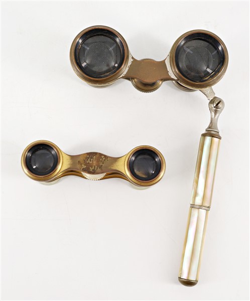 Due binocoli da teatro in madreperla e metallo (uno mancante di manico, difetti)