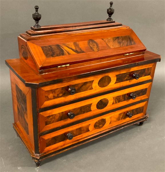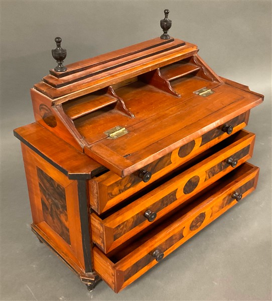 Modello di ribalta lastronato in noce e radica d'ulivo, con profili e pinnacoli ebanizzati. Scarabattolo con vani e fronte a tre cassetti. Secolo XIX (cm 46x40x19) (lievi difetti)