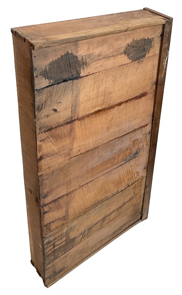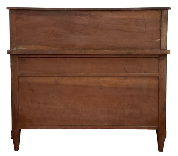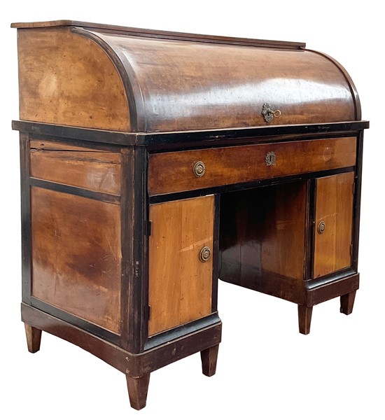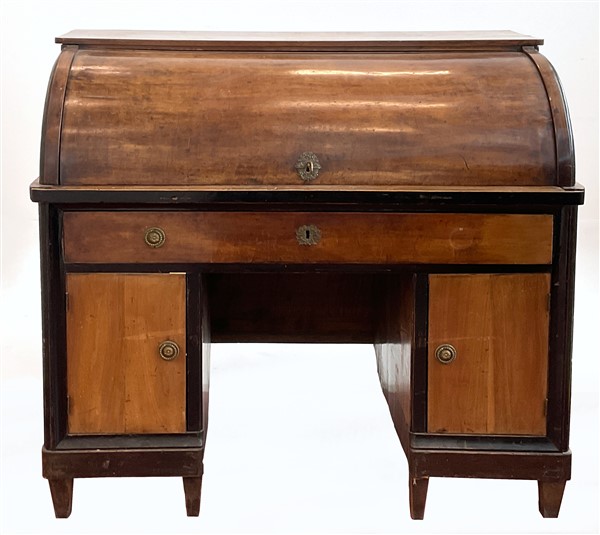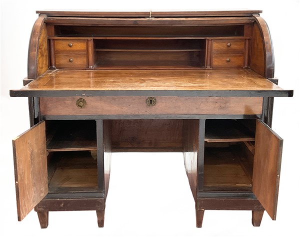 Scrittoio con ribalta a rullo in legni vari e bordure ebanizzate, fronte a due ante e un cassetto, interno con quattro tiretti e vani a giorno. Secolo XIX (cm 126x113x63) (difetti)