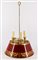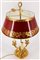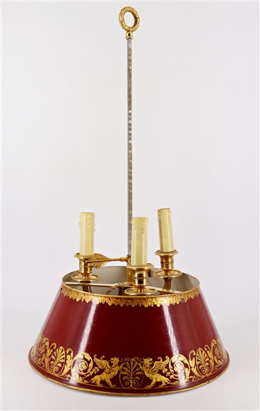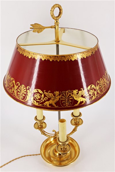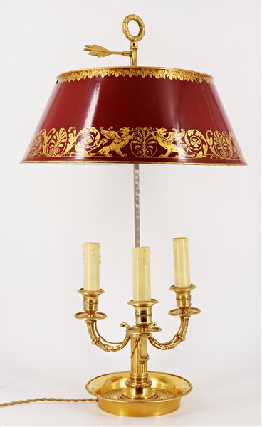 Lampada Bouillotte a tre fiamme in bronzo dorato con paralume in metallo decorato in oro a grifoni, girali e palmette su fondo rosso (h. cm 61) (lievi difetti)