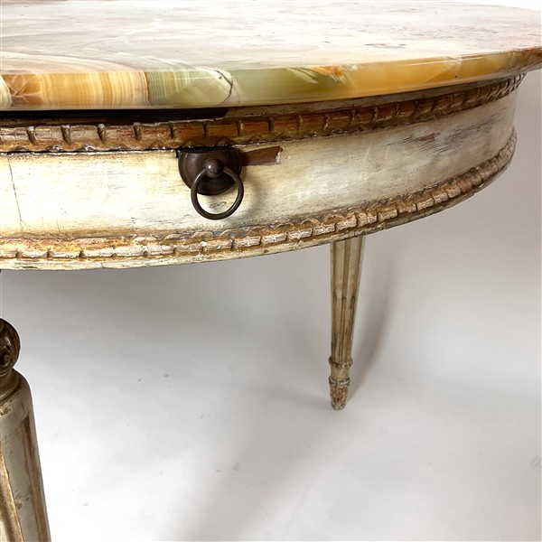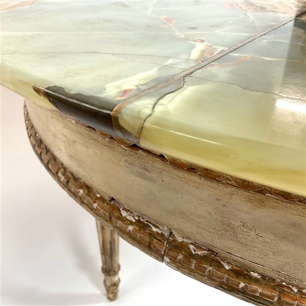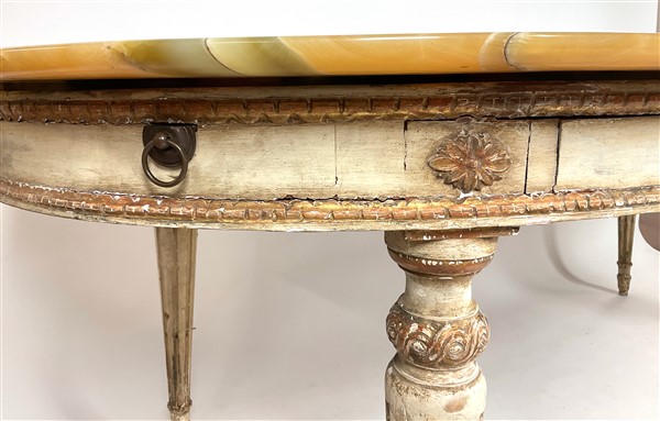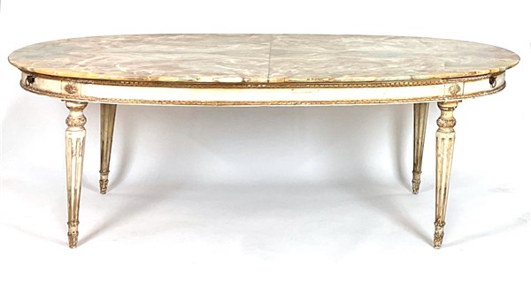 Tavolo da pranzo di forma ovale in legno intagliato e laccato con gambe scanalate e piano in onice (cm 225x78x115,5) (difetti)