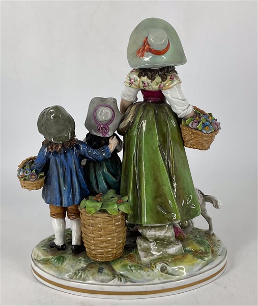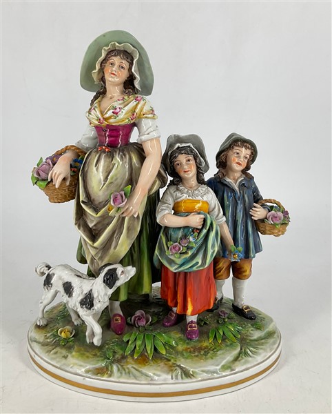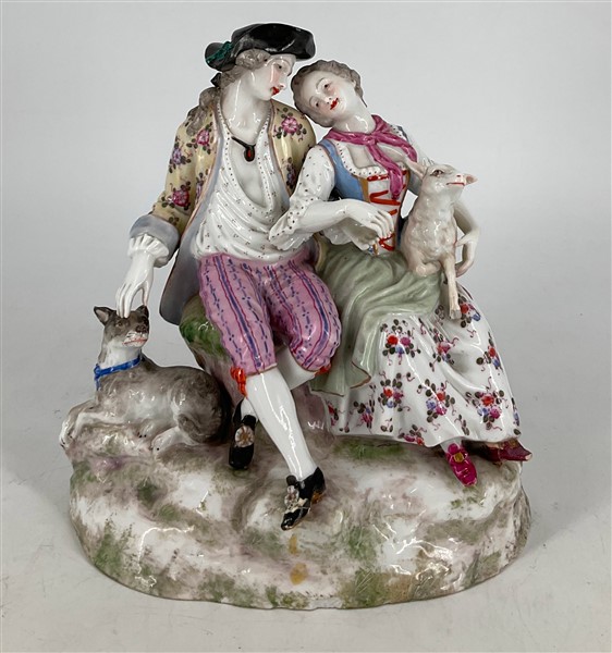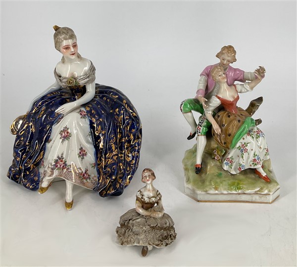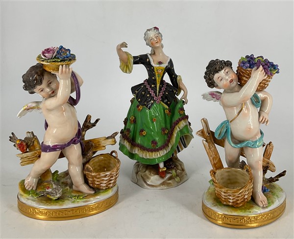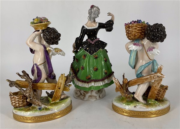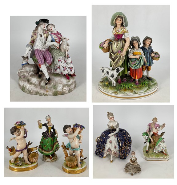 Manifatture differenti. Lotto in porcellana policroma composto da due gruppi con scene galanti, una scena pastorale, tre gentildonne e due putti con cesta d'uva e fiori (h max cm 28) (difetti e restauri)