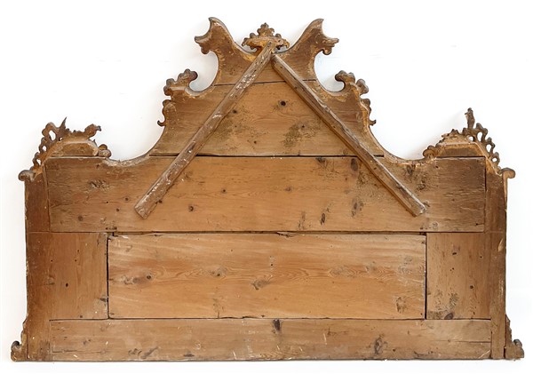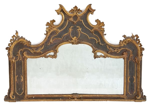 Caminiera in legno intagliato, dorato e dipinto di forma sagomata con cimasa a volute contrapposte. Lombardia, secolo XVIII (cm 111x165) (difetti e restauri)