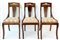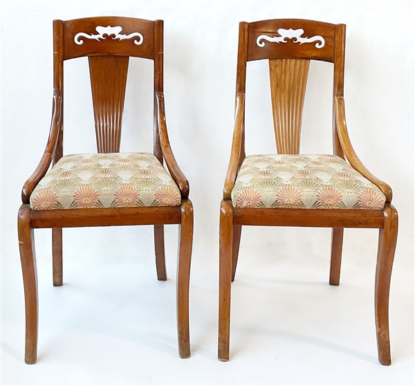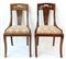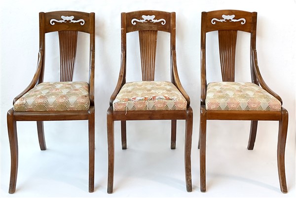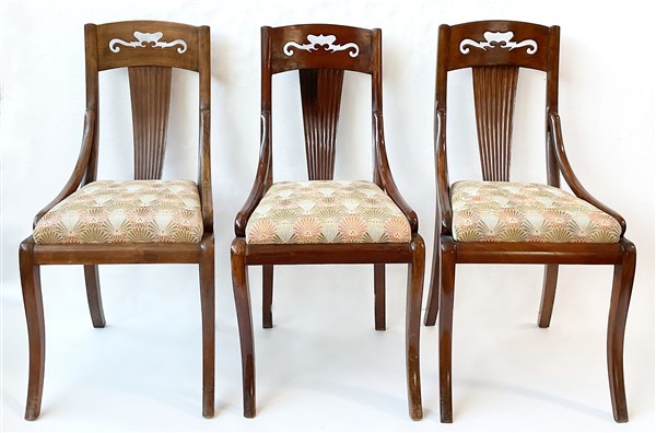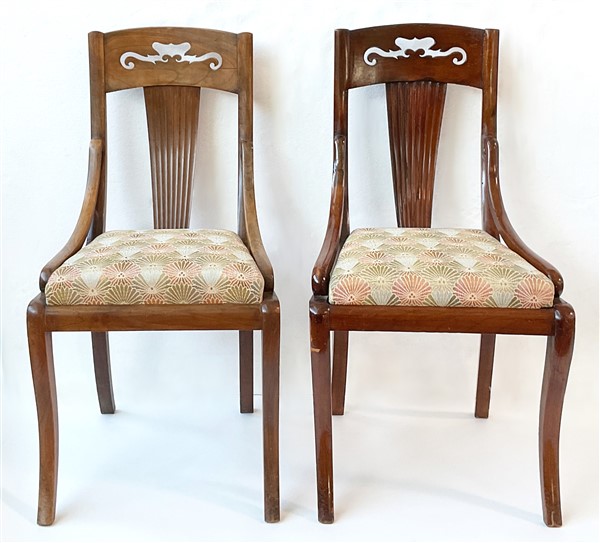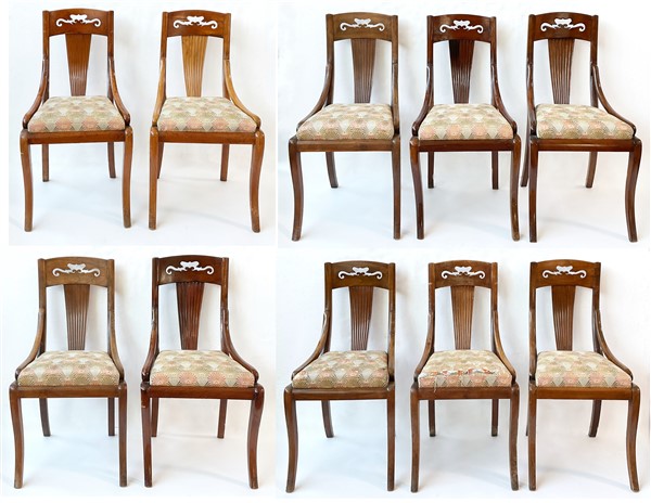 Dieci sedie in noce massello con schienale a giorno traforato, seduta in tessuto e gambe a sciabola. Italia, inizio secolo XX. (difetti)
