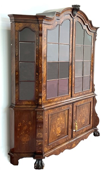 Credenza con vetrina a doppio corpo interamente impiallacciata e intarsiata a motivi floreali in legni di varia essenza, parte inferiore a due ante con piedi anteriori ferini, parte superiore con fronte a due ante e fianchi con vetri, cappello sagomato centrato da motivo a rocaille intagliato. Olanda, secolo XIX (cm 197x250x50) (difetti)