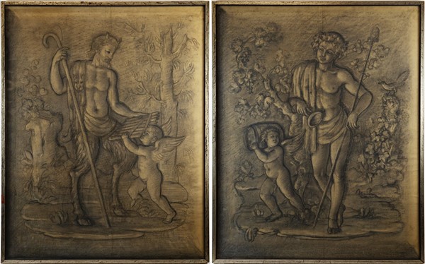 Coppia di disegni preparatori a carboncino raffiguranti "Bacco con amorino e Fauno con amorino" (cm 95x70)
