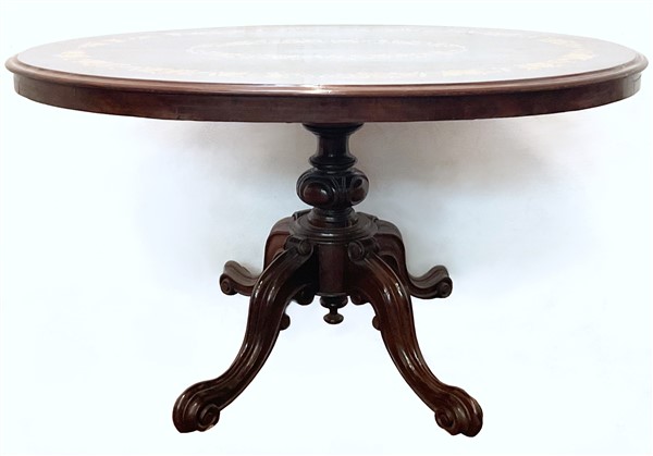 Tavolo da centro inglese con piano ovale intarsiato a motivi floreali ed apribile a vela gamba centrale a balaustro con quattro piedi intagliati e sagomati (cm 148x80x108) (lievi difetti)