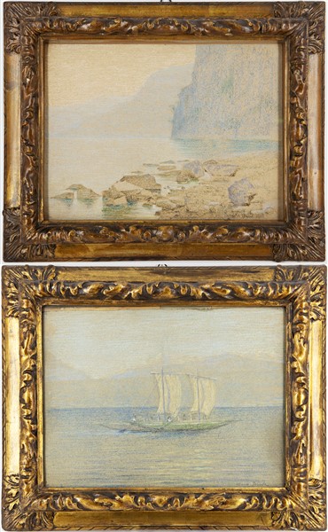 Lotto composto da due "Scorci lacustri" a pastelli colorati su cartoncino, firmati in basso a destra, di cui uno datato (cm 26x35)