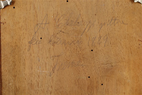 Ignoto del secolo XIX "Angelo musicante" 1889 olio su tavola ad ogiva a fondo